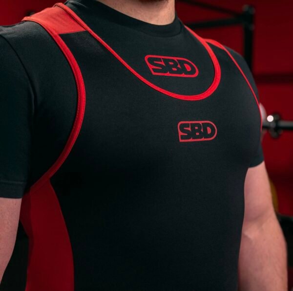 - Franja en tejido más ligero color rojo fabricada con fibras de Nylon & Lycra® para minimizar la restricción y ayudar con la comodidad.